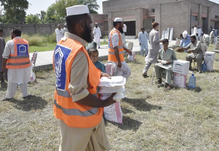 پشاور کے مضافات میں رضاکار سیلاب زدگان میں امدادی سامان تقسیم کررہے ہیں ۔ (شِنہوا)