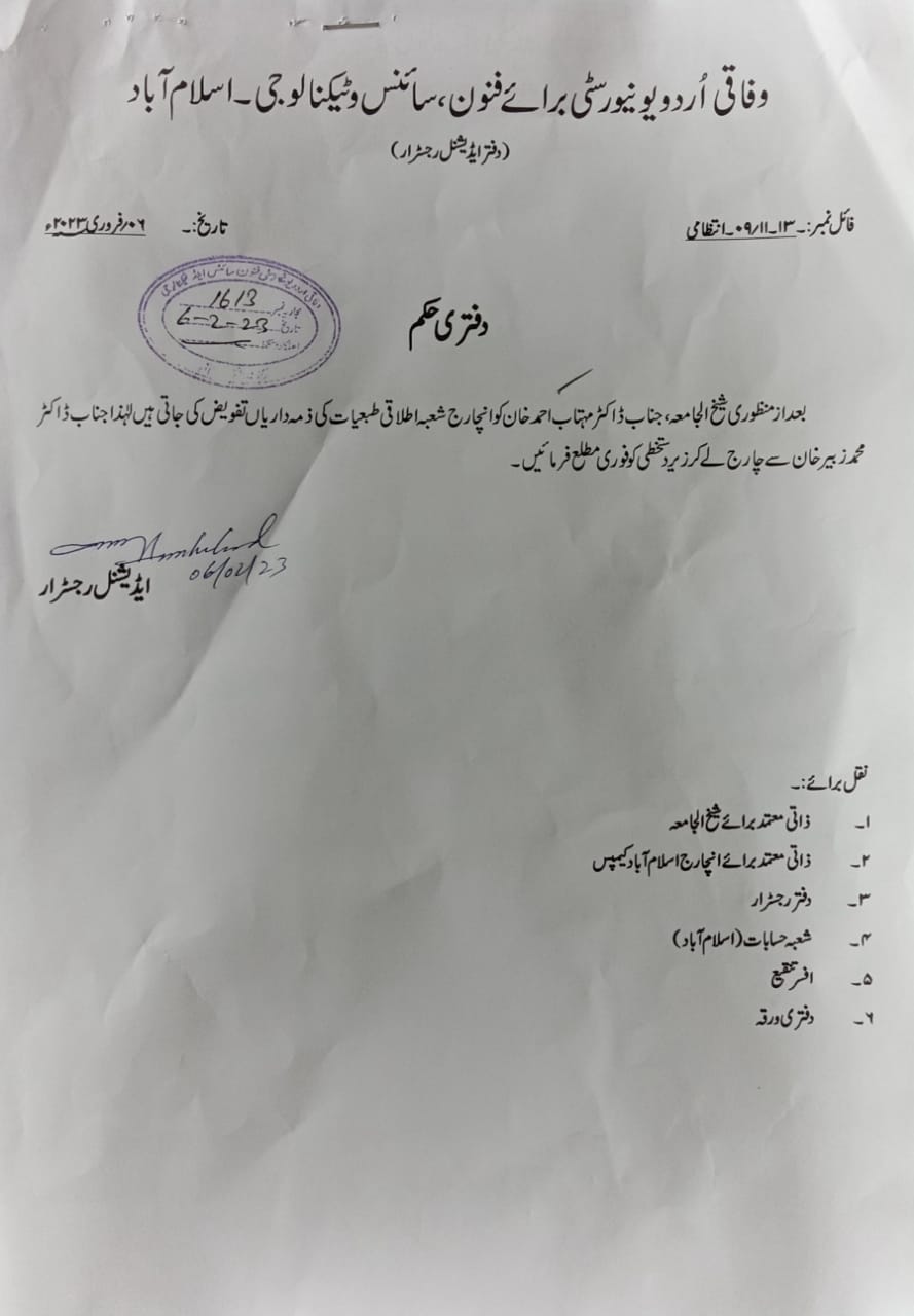 وفاقی اردو یونیورسٹی اسلام آباد کیمپس میں طالبہ ہراسگی ثابت ہونے پر عہدے سے ہٹائے گئے شعبہ فزکس کے سربراہ ڈاکٹر زبیرخان نیازی کو ایک ماہ بعد دوبارہ شعبہ فزکس کا سربراہ لگادیاگیا،شعبہ فزکس کے سربراہ ڈاکٹر زبیرخان نیازی پر ہراسگی کی شکایت کرنے والی طالبہ کو دھمکیاں دینے کے الزامات کمیٹی میں ثابت ہوئے تھے ،ہراسگی کمیٹی کی رپورٹ آنے کے بعد6فروری 2023 کو شعبہ فزکس کی سربراہی سے ہٹایا گیاتھا، ایچ او ڈی زبیرخان نیازی نے ہراسگی کامعاملہ واپس نہ لینے پرطالبہ کوپیپرمیں فیل کردیاتھااور دباؤ ڈالنے کے لیے طالبہ کے والد کو اپنے دفتر بلایاتھا۔اس خبر رساں ادارے کے مطابق وفاقی اردو یونیورسٹی اسلام آباد کیمپس میں ہراسانی کا ایک ایسے کیس کا انکشاف ہواہے جس میں شعبہ فزکس کے کنٹریکٹ پر بھرتی کئے گئے پروفیسر نے اپنی طالبہ کو ہراساں کیاطالبہ نے شکایت کی تو پورا شعبہ فزکس طالبہ کے ہی خلاف ہوگیا۔جس پر 28دسمبر2022 کوطالبہ نے ہراسانی کی تحریری درخواست انچارج کیمپس کودی اور تحقیقات کامطالبہ کیا مگر درخواست کی کہ اس کے والدین کو یہ بات نہ بتائی جائے ۔طالبہ کی جانب سے یونیورسٹی انتظامیہ کو دی گئی طالبہ کی جانب انتظامیہ کو دی گئی درخواست میں پروفیسر زاہد سرفراز پر انہیں وٹس ایپ پر نامناسب پیغامات بھیجنے اور علیحدہ ملاقات کے مطالبات کی شکایات کی گئی