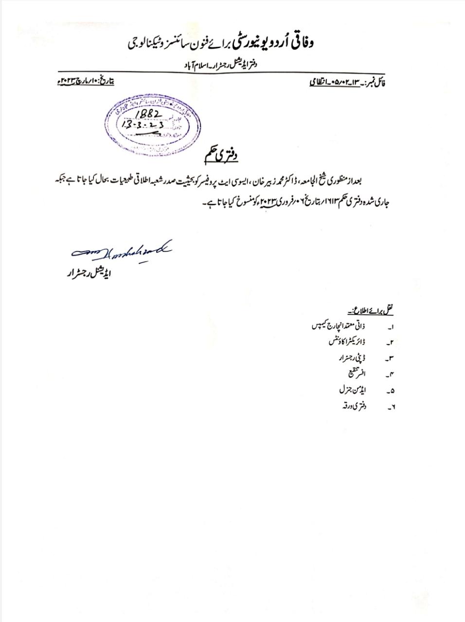 دستیاب دستاویزات کے مطابق وفاقی اردو یونیورسٹی اسلام آباد کیمپس کے رجسٹرار نے 13مارچ 2023کو ڈاکٹر زبیر خان نیازی بطور شعبہ فزکس کے سربراہ دوبارہ بحال کردیا ہے ۔واضح رہے کہ ہراسگی کمیٹی میں ڈاکٹر زبیر نیازی پر طالبہ کو حراساں کر نا نہ صرف ثابت ہواہے بلکہ کمیٹی نے انکو ہٹانے کا بھی کہاتھااور طالبہ کے پیر(پرچہ) جس میں زیبرنیازی نے ان کو فیل کیاتھا کے بارے میں کمیٹی نے طالبہ کے آئندہ نتائج اور پرچوں کو غیر جانبدار فورم سے تصدیق کرنے کا حکم دے دیااور انتظامیہ کو اس صورت حال کے تدارک کے لیے عملی اقدامات کرنے کاکہا۔مزید تحقیق اور دستاویزات سے معلوم ہواکہ ڈاکٹر زبیرخان نیازی کو جب تک ہراسگی انکوائری ہورہی تھی ان کو شعبہ فزکس کی سربراہی سے معطل نہیں کیاگیا تھاجس کی وجہ سے انہوںنے انکوائری پر بھی اثرانداز ہونے کی کوشش کی۔ ڈاکٹر زبیرخان نیازی کو انکوائری مکمل ہونے کے بعد قصوروار ثابت ہونے پر شعبہ فزکس کی سربراہی سے ہٹایاگیا تھا۔ترجمان وفاقی اردو یونیورسٹی نے کہاکہ ڈاکٹر زبیرنیازی کو اس وقت تک شعبہ فزکس کی سربراہی سے ہٹایا گیا جب تک انکوائری ہورہی تھی لیکن وہ کسی چیز میں ملوث نہیں تھے وہ میرٹ پر شعبہ فزکس میں سے زیادہ سینئر استاد ہیں۔ (محمداویس)