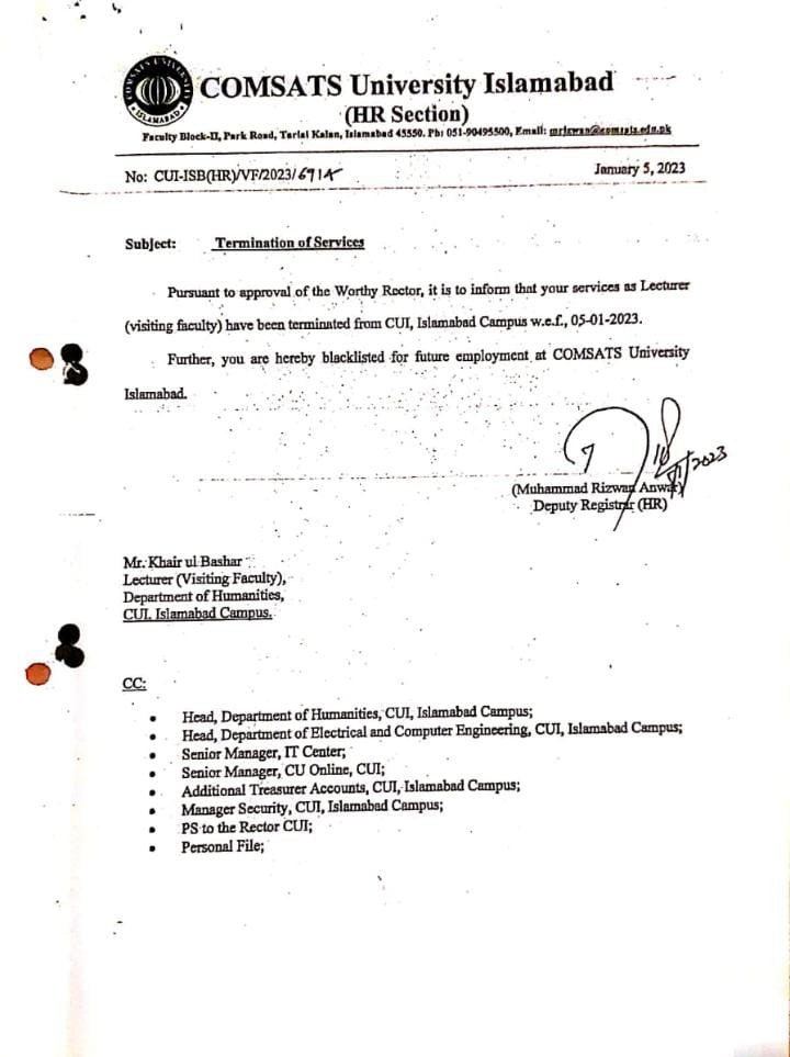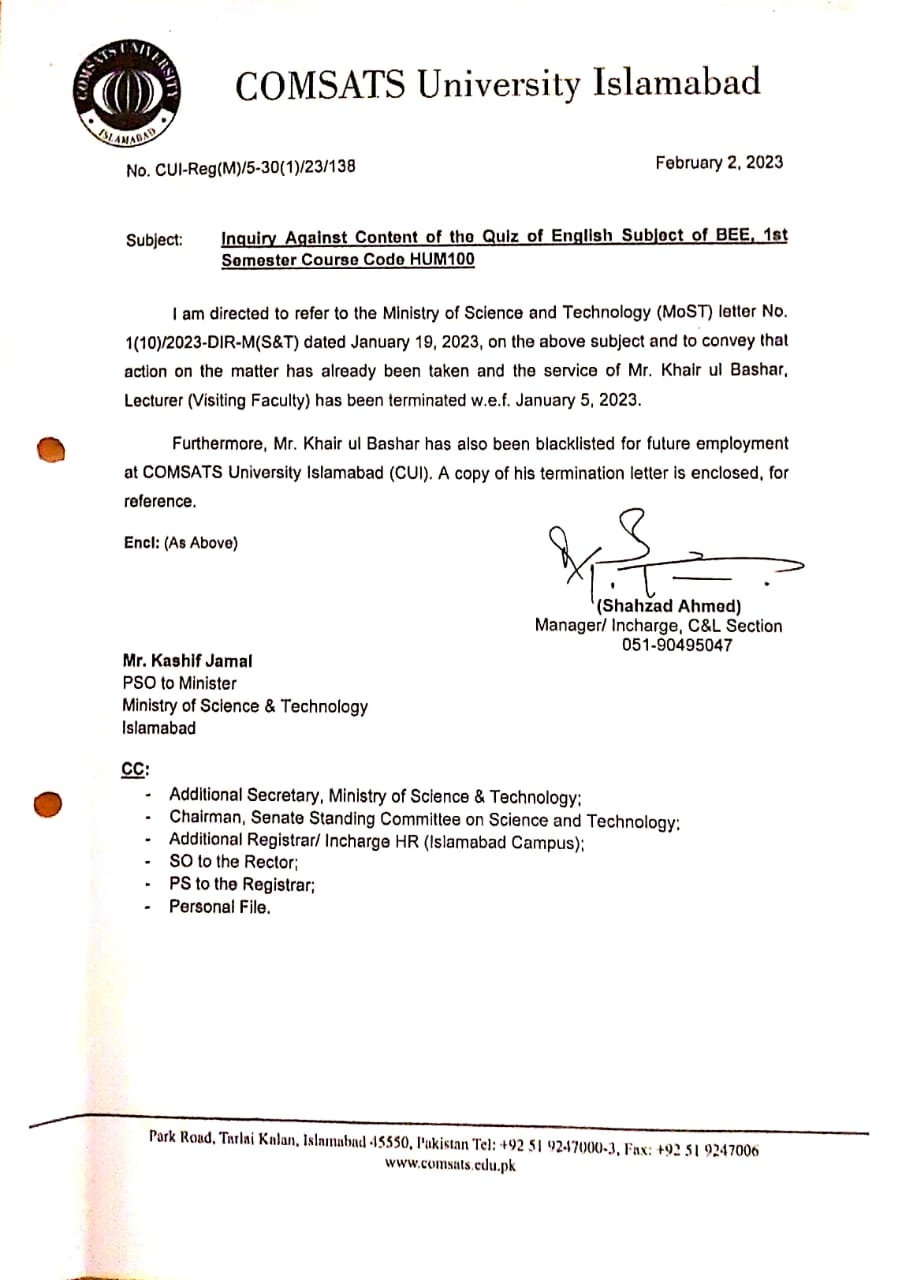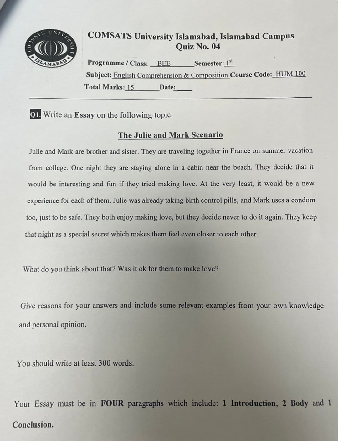 ”جولی اور مارک بہن بھائی ہیں، وہ کالج سے گرمیوں کی چھٹیوں میں فرانس میں اکٹھے سفر کر رہے ہیں۔اور غیر فطری تعلق قائم کرتے ہیں یکن انہوں نے فیصلہ کیا کہ یہ بات کسی اور کو نہیں بتانی اور ایسا پھر کبھی نہیں کرنا ۔ کوئز میں پوچھا۔گیا ’بتائیے کہ کیا دونوں نے جو کام کیا وہ درست تھا، اپنے جواب کے لیے مناسب دلائل بھی دیجیے اور اپنے مشاہدے کی حد تک کچھ مثالیں بھی دیجیے“۔اور مضمون 300الفاظ پر مشتمل ہو۔جس پر طلبا و طالبات سراپا احتجاج بن گئے تو یونیورسٹی انتظامیہ نے پانچ جنوری کو جز وقتی لیکچرار خیر البشر کو فوری نوکری سے نکال کر بلیک لسٹ کر دیا جبکہ خیر البشر نے اپنے موقف میں یونیورسٹی کو بتایا کہ یہ سوال پی ایم اے کے نفسیاتی ٹیسٹ کی تیاری کے مواد سے نقل کیا گیا تھا اور کئی بار آئی ایس ایس بی میں آچکا ہے۔دوسری جانب وزارت سائنس اینڈ ٹیکنالوجی کو 19جنوری کو خیال آیا۔کہ اس پہ انکوائری کرائی جائے تو انہوں نے کامسٹس یونیورسٹی کو مراسلہ لکھ دیا تاکہ وہ اس معاملے پر خودبری الزمہ ہو۔جائیں 19جنوری کو لکھے گئے وزارتی مراسلے پر فوری ردعمل دینے کے بجائے یونیورسٹی نے دو فروری کو وزارت کو جواب دینا گوارہ کیا اور بتایا کہ ہم پہلے ہی اس پہ ایکشن لے چکے ہیں اور متعلقہ لیکچرار کو نوکری سے نکال کر بلیک لسٹ کر دیا گیا ہے.(محمداویس)