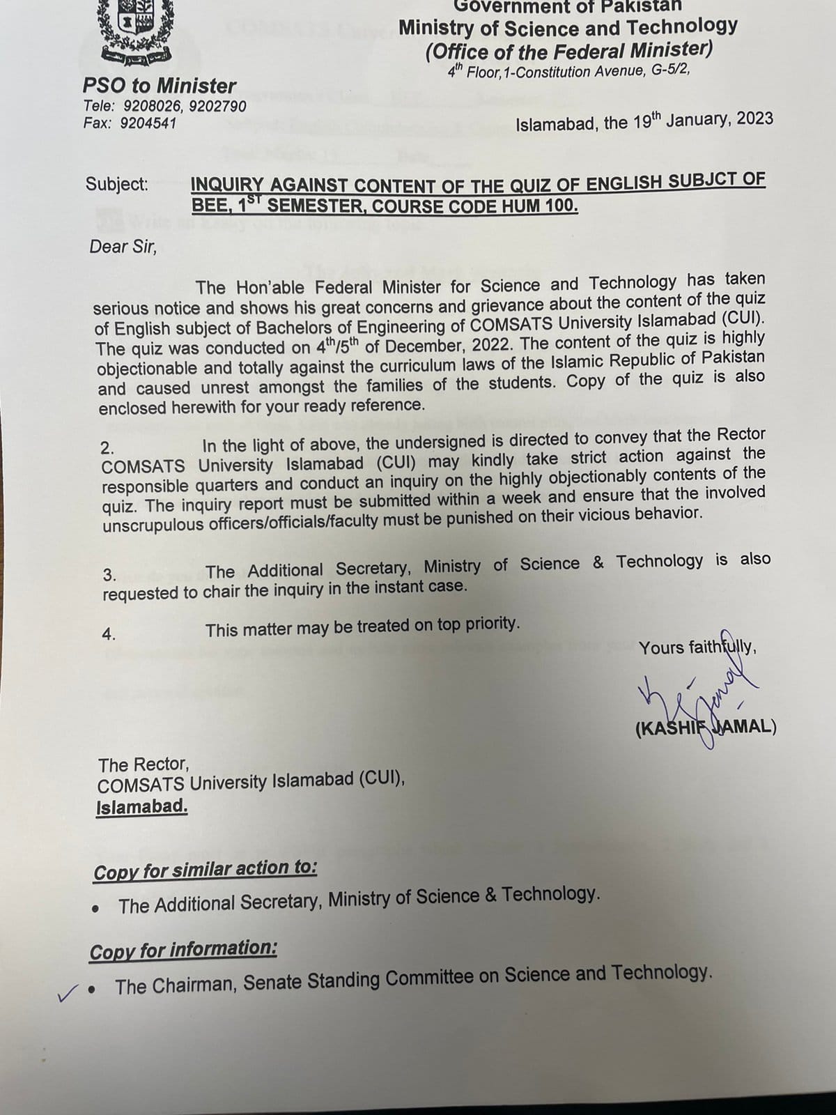 ملک کی صف اول کی جامعہ کامسٹیس یونیورسٹی کے امتحان میں اسلامی اقدار کے برخلاف بہن بھائی کے مقدس رشتے بارے غلط سوال دئیے جانے پر ملک بھر شدید غم و غصہ پایا جانے لگا،کامسٹیس یونیورسٹی انتظامیہ نے کسی بھی ممکنہ ردعمل سے بچنے کے لئے سوال بنانے والے جز وقتی لیکچرار کو نوکری سے نکال کر بلیک لسٹ قرار دیدیا دوسری جانب وزارت سائنس اینڈ ٹیکنالوجی کے وزیر کے علم میں آنے پر انہوں نے ایکشن لینے کے لئے جامعہ کو مراسلہ لکھ دیا جس پر یونیورسٹی نے کمال مہارت کا ثبوت دیتے ہوئے کہا کہ ہم پہلے ہی اس پر ایکشن لے چکے ہیں ۔تفصیلات کے مطابق کامسیٹس یو۔یورسٹی BEEکے پہلے سمسٹر میں کوئز سوال دیا گیا کہ
