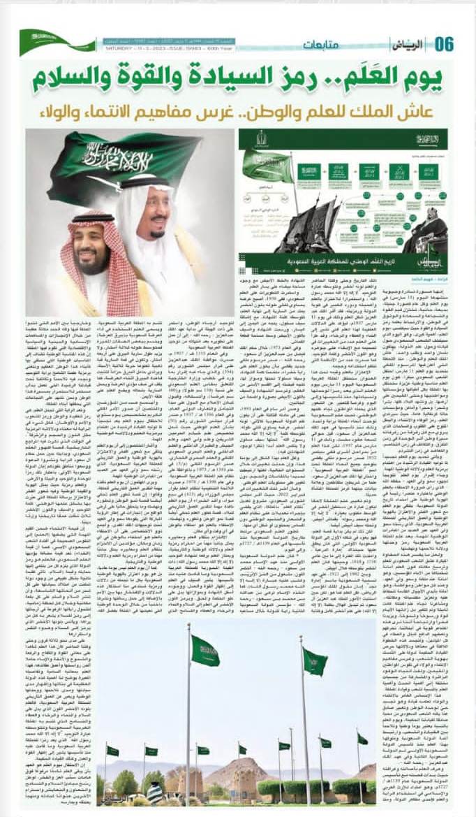 إنها صورة نادرة وحيوية سنشهدها اليوم (11 مارس) في يوم العَلَم وكل عام كصورة جميلة، بديعة، حانية، تختزل قيم القوة والشجاعة والسعادة والوثوق في الوطن، والارتباط بعلمه رمز السيادة والقوة حيث سيكتسب «يوم العلم» أهمية كبرى، وهو اليوم الذي سيلتف الشعب السعودي حول قيادته وحول علم الدّولة، يهتفون بلسان واحد وبقلب واحد: "عاش الملك للعلم والوطن.. منذ اللحظة التي أعلن فيها المرسوم الملكي بتحديد يوم العلم 11 مارس، احتفل الشعب السعودي مبكرا، كون يوم العلم مناسبة وطنية عزيزة ستحتفل بها المملكة بكل أطيافها ومؤسساتها ومواطنيها وحتى المقيمين على أرضها، بل وتشهد البلاد كلها، بشراً وشجراً وحجراً وأماكن ومؤسسات حالة كرنفالية عامة، حيث سيرتدي العلَم، رمز الوفاء والانتماء، والبطل المتوج على القلوب والساحات الذي يروي مع كل رفرفة من رفرفاته سيرة وطن آثر الوحدة في زمن التفرّق، والتكاتف في زمن التخاصم، والتعاضد في زمن التشرذم.