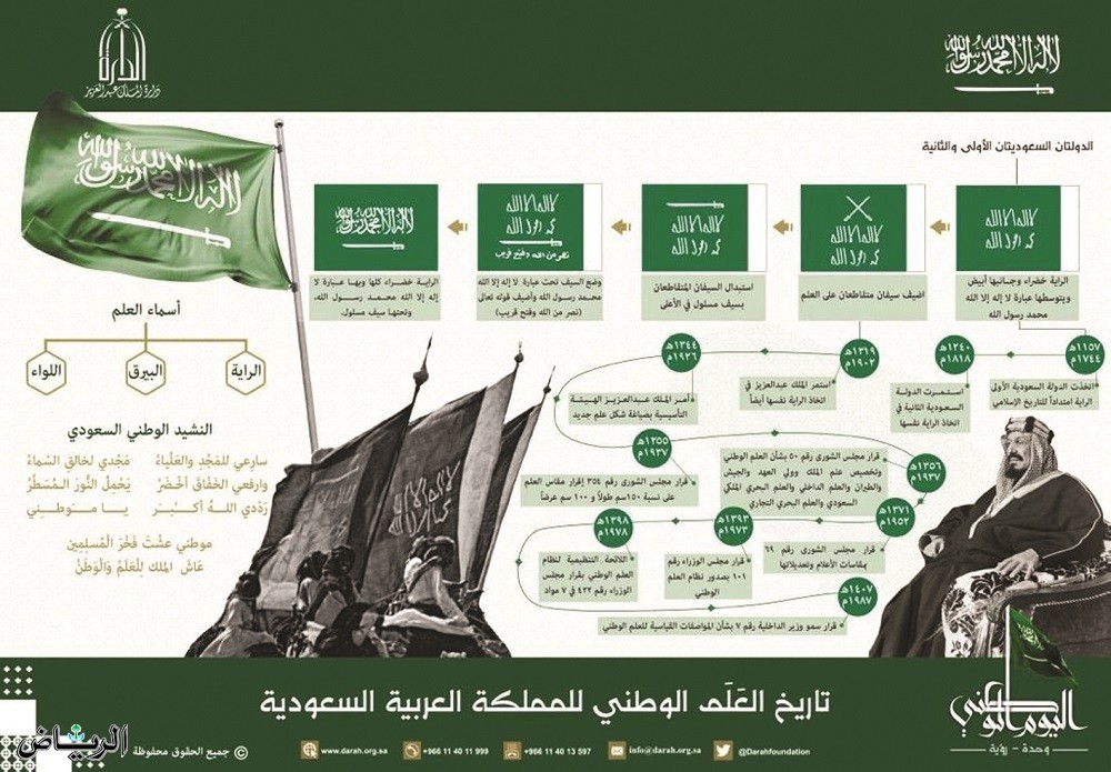 وتعد الراية التي تحمل العلم، هي رمز للعقيدة والوطن ورمز للشعوب والأمم والأوطان، فكل شيء في الراية له معناه ودلالاته الرمزية مثل اللون والحجم والزخرفة"، في الوقت الذي ذكرت فيه المراجع التاريخية، قصة ظهور العلم السعودي، وبدايته حين حمل حكام آل سعود الراية ونشروا الدعوة ووسعوا مناطق نفوذهم إبان الدولة السعودية الأولى، باعتبار ذلك رمزاً للوحدة والتوحيد والبيئة والأرض.