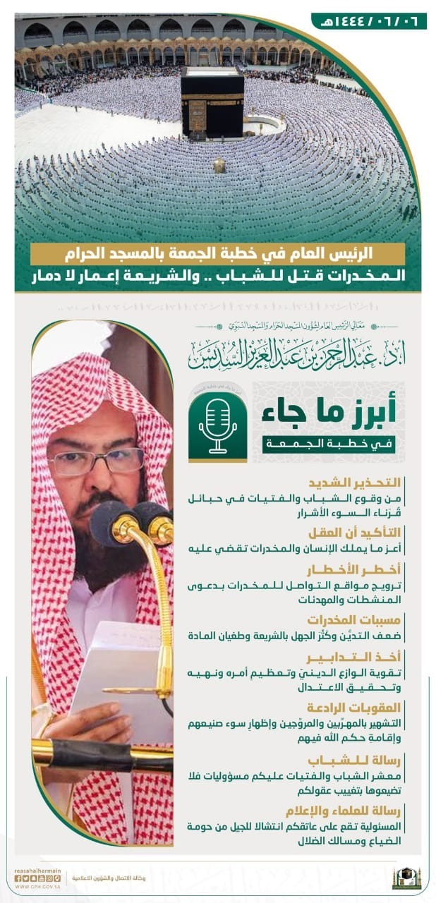 عندما يخطب الشيخ القدير حفظه الله.الامّة تنْصتّ. تسْتمع تقْتنع.قوّة الخطابة والتأثير. وعِظمّ التفكير والتدبير.خدمة #الحرمين شرف لايضاهيه شرفّ.. معالي الشيخ عبدالرحمن #السديس في خطبة #الجمعة:المخدرات قتْل للشباب..الشريعة اعمار لادمار