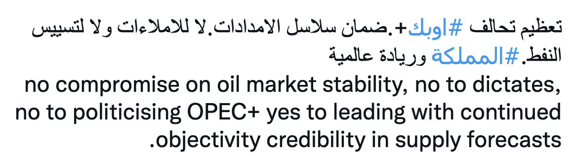 وإنه في الوقت الذي تسعى فيه المملكة للمحافظة على متانة علاقاتها مع كافة الدول الصديقة، فإنها تؤكد في الوقت ذاته أنها لا تقبل الإملاءات وترفض أي تصرفات أو مساعٍ تهدف لتحوير الأهداف السامية التي تعمل عليها لحماية الاقتصاد العالمي من تقلبات الأسواق البترولية. خصوصًا أن معالجة التحديات النفطية تتطلب إقامة حوار بناء غير مسيّس، والنظر بحكمة وعقلانية لما يخدم مصالح الدول كافة.