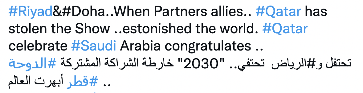 ولا يعد الاحتفاء الشعبي والرسمي بين البلدين مستغربًا، نظرًا لما للدوحة والرياض من علاقات خاصة، حيث تجمعهما علاقات الجوار ودول مجلس التعاون والدم العربي والمكون الإسلامي والتعاون الدولي، إضافة إلى المصير المشترك.