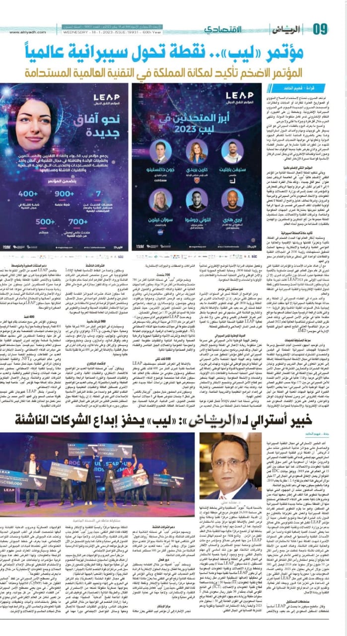 وتأتي نسخة هذا العام لـleap لتمثل قفزة نوعية اقتصادية ضخمة داخل المملكة من خلال العديد من الشراكات، والصفقات، والجولات الاستثمارية.700 متحدث ويضم مؤتمر"ليب" في نسخته الثانية أكثر من 700 متحدث ومتحدثة من أكثر من 50 دولة، يمثلون أهم الجهات العالمية في التقنية والذكاء الاصطناعي والتحول الرقمي كجوزيف برادلي، والدكتور ساتيامبريدارشي، وفاليري مورينانت، وعبد الرحمن الذهيبان، وصوفيا جرافلوند، وبيغي جونسون، وإدوساادارو، وراجيف راماسوامي ونخبة من المتحدثين المميزين الآخرين، حيث تتجاوز مشاركة السيدات أكثرمن 35 % من إجمالي المتحدثين.ويعد حدث LEAP التكنولوجي الذي سيجري بين 6 - 9 فبراير من عام 2023 في مدينة الرياض بأنه سيستعرض تقنيات متنوعة في مجالات متعددة منها الذكاء الاصطناعي (AI ، البلوكتشين والعملات الرقمية, الروبوتيات الطباعة ثلاثية الأبعاد وإنترنت الأشياء والتقنية الحيوية والرعاية الصحية والحركة الذكية والتقنيات مفتوحة المصدر والحوسبة الكمومية واتصالات الجيل الخامس والفضاء والأقمار الصناعية والتقنية المالية.600 قائد تقني بالإضافة إلى المعرض الضخم، سيستضيف LEAP كمناسبة تقنية كبرى أكثر من 600 قائد تقني ومفكر مستقبلي ومسؤول حكومي من مختلف بقاع العالم، كما سيكون هناك قمة مخصصة لموضوع الذكاء الاصطناعي سيستعرض فيها المخترعون دراسات أمثلة جديدة تغير واقع المجال.وسيكون لدى الحضور خيار حضور “أوربتال تالكس” على شكل 8 جلسات تخوض عميقاً في 8 مجالات أساسية تتضمن التمويل، المدن الذكية، الرعاية الصحية، بيع التجزئة، الصناعة، الطاقة، التعليم والاقتصاد الخلاق.