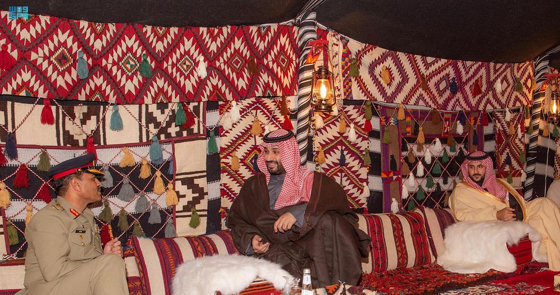 استقبل صاحب السمو الملكي الأمير محمد بن سلمان بن عبدالعزيز، ولي العهد رئيس مجلس الوزراء، في المخيم الشتوي في العلا، اليوم، معالي قائد الجيش الباكستاني الفريق أول عاصم منير. وجرى خلال الاستقبال، استعراض العلاقات الثنائية وفرص تطويرها، بالإضافة إلى عدد من المسائل ذات الاهتمام المشترك. حضر الاستقبال، صاحب السمو الملكي الأمير خالد بن سلمان بن عبدالعزيز وزير الدفاع، ومعالي وزير الدولة عضو مجلس الوزراء مستشار الأمن الوطني الدكتور مساعد بن محمد العيبان. فيما حضر من الجانب الباكستاني، مدير مكتب قائد الجيش الباكستاني اللواء محمد عرفان، والسفير الباكستاني لدى المملكة أمير كهرمان، والملحق العسكري بسفارة باكستان لدى المملكة العميد محمد عاصم.