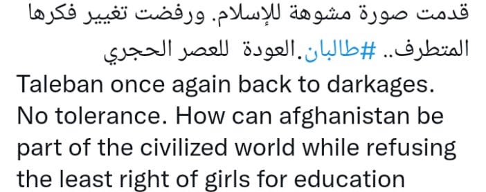 فيما أعربت وزارة الخارجية السعودية، عن استغراب وأسف المملكة لقرار حكومة تصريف الأعمال الأفغانية بمنع الفتيات الأفغانيات من حق التعليم الجامعي. ودعت الخارجية السعودية حكومة طالبان، للتراجع عن هذا القرار الذي يثير الاستغراب في جميع الدول الإسلامية، ويتنافى مع إعطاء المرأة الأفغانية حقوقها الشرعية الكاملة، وعلى رأسها حق التعليم الذي يسهم بدعم الأمن والاستقرار والتنمية والازدهار لأفغانستان وشعبها الشقيق.